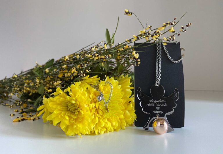 Composto dalla sagoma di un angelo con inciso frasi di buon auspicio per la mamma e il nascituro, al centro la sfera in acciaio fonte di piacevoli suoni e infine un piccolo bracciale per il neonato.